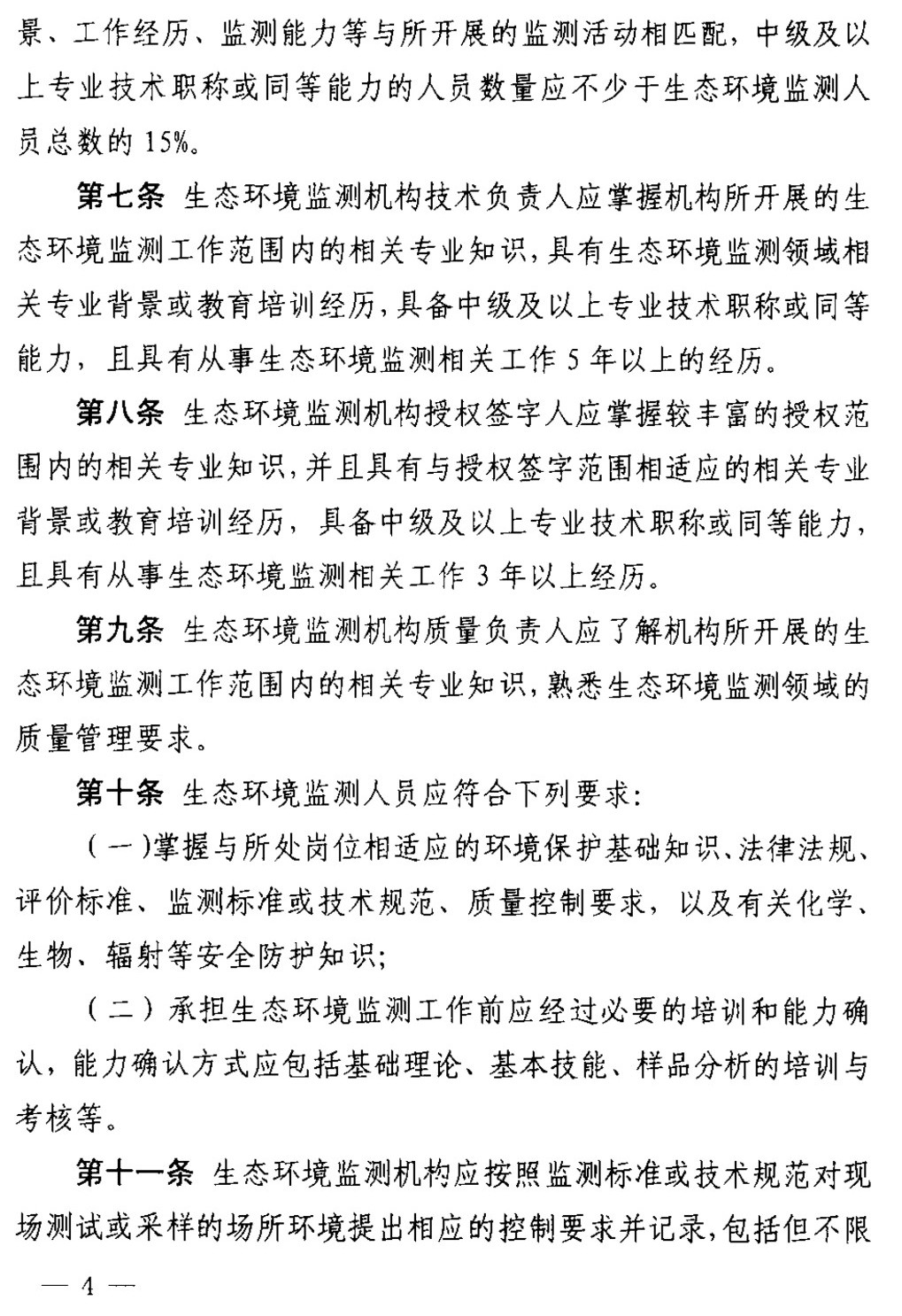第十條 生態(tài)環(huán)境監(jiān)測人員應(yīng)符合下列要求: